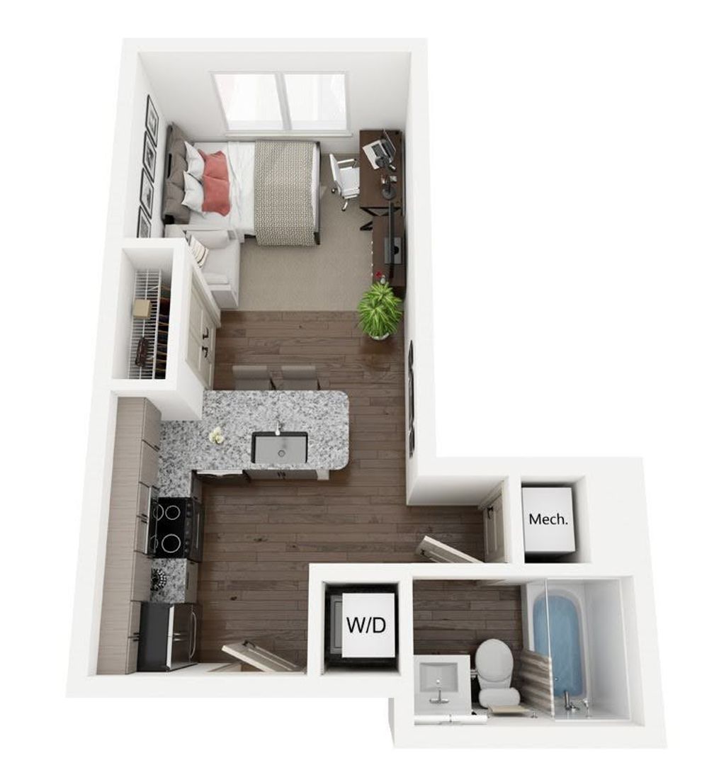 This studio apartment comes equipped with a full size matress & frame, an entertainment stand, two barstools, a dresser, and one night stand!